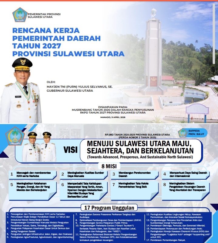 Gubernur Yulius juga menekankan tema pembangunan tahun 2027 lebih difokuskan pada “Percepatan Peletakan Fondasi Transformasi Sulawesi Utara”.