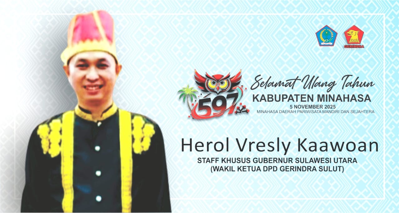 Sulawesi Utara – Dalam rangka memperingati Hari Ulang Tahun (HUT) Kabupaten Minahasa yang ke-597, Herol Vresly Kaawoan (HVK) Staff Khusus Gubernur Provinsi Sulawesi Utara (Sulut) sekaligus Wakil Ketua DPD Partai Gerindra Sulut, menyampaikan ucapan selamat dan harapan terbaiknya.