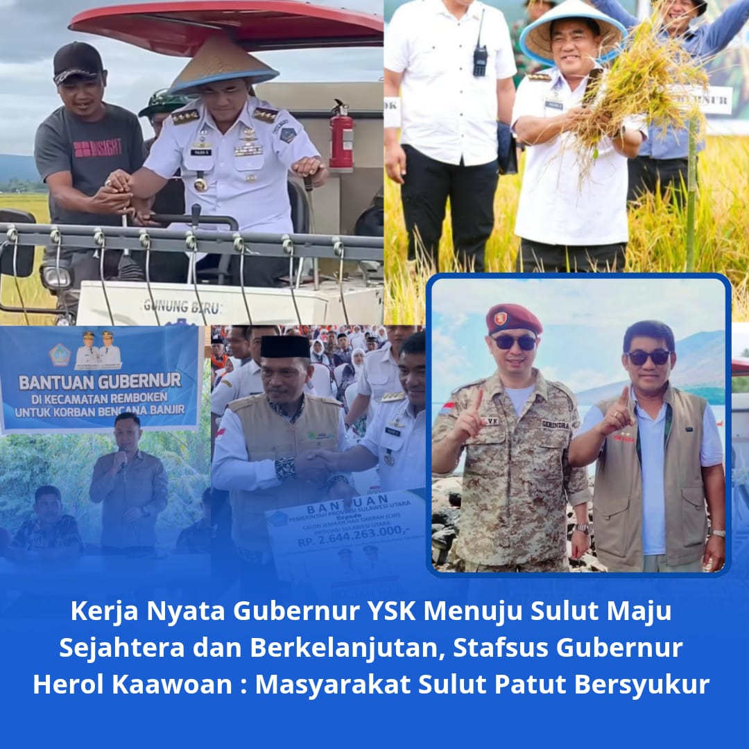 Staf Khusus Gubernur bidang Pemberdayaan Masyarakat, Herol Vresly Kaawoan mengungkapkan bahwa masyarakat Sulut patut berbangga dan bersyukur dengan kepemimpinan Gubernur Mayjen TNI (Purn) Yulius Selvanus yang memiliki sinergitas dengan Pemerintah Pusat.