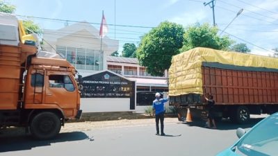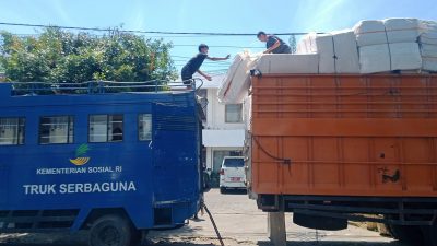 Pantauan media, dua kendaraan truk berat (Heavy Duty) dengan kapasitas 10 ton sedang melakukan bongkar muat barang untuk dibawa ke gudang Dinas Sosial.