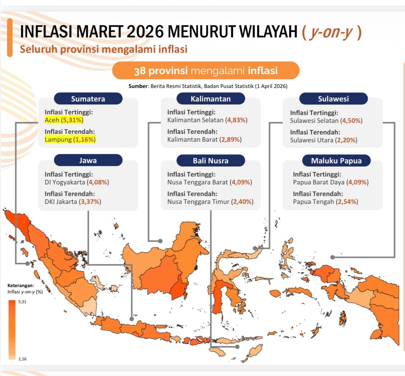 Secara nasional, kelompok makanan, minuman, dan tembakau memberikan andil terbesar pada inflasi Maret 2026, dengan komoditas utama seperti ikan segar, daging ayam ras, beras, telur ayam ras, dan cabai rawit. Namun, melalui langkah-langkah strategis Pemerintah Provinsi Sulawesi Utara dalam menjaga rantai pasok, tekanan pada komoditas pangan di daerah dapat diminimalisir.
