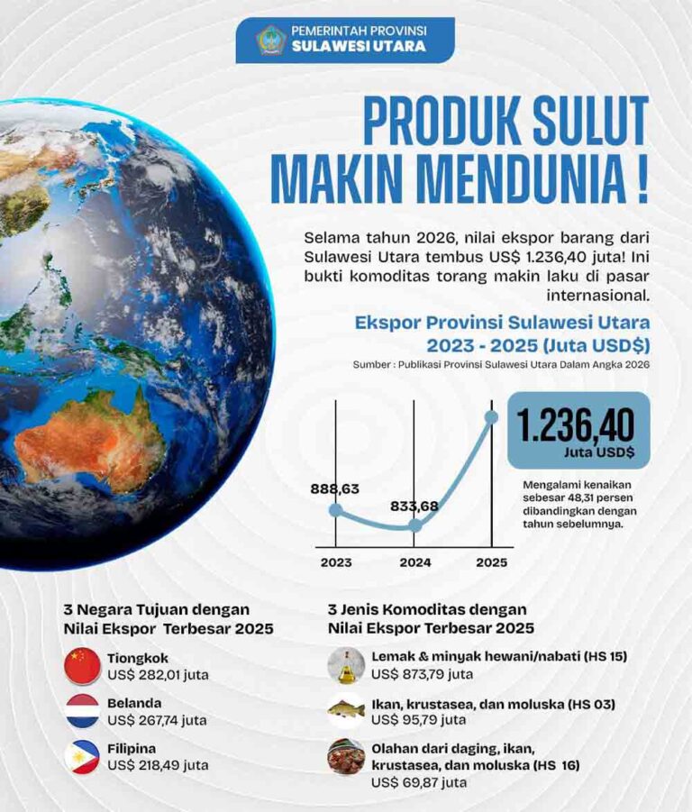 Di pasar internasional, produk-produk asal Sulawesi Utara semakin kompetitif. Nilai ekspor barang dari Sulut sepanjang tahun 2025 sukses menembus angka US$ 1.236,40 juta, mengalami kenaikan sebesar 48,31% dibandingkan tahun sebelumnya.