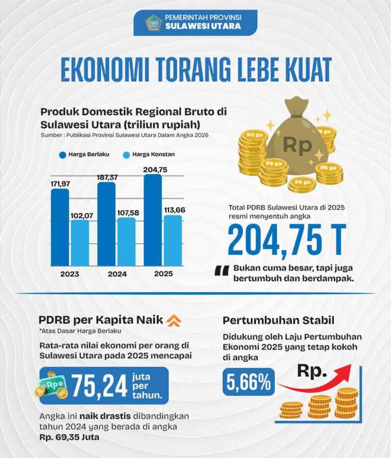 Pada tahun 2025, total Produk Domestik Regional Bruto (PDRB) Sulut atas dasar harga berlaku resmi menyentuh angka Rp 204,75 Triliun.