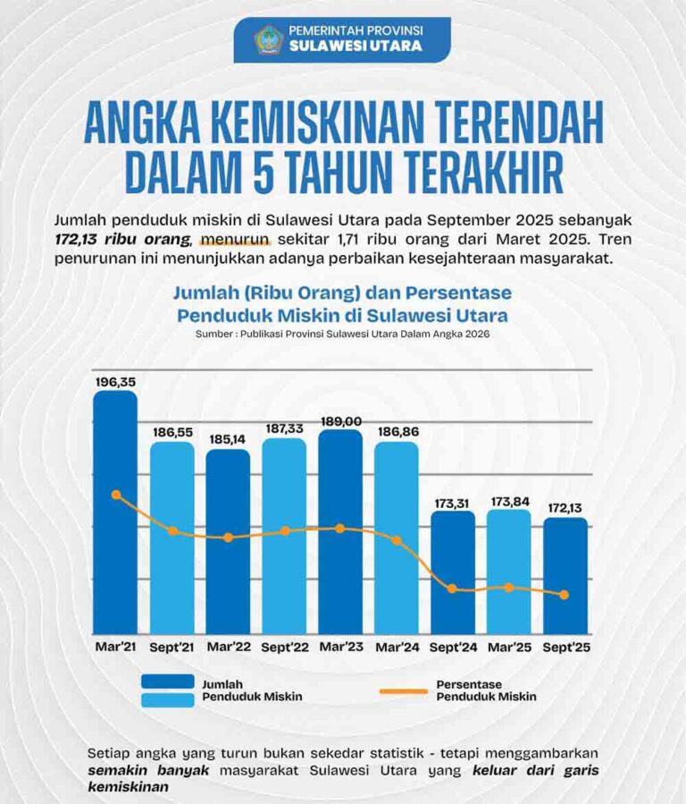 Kesejahteraan Rakyat: Angka Kemiskinan Terendah dalam 5 Tahun. Salah satu pencapaian paling bermakna bagi masyarakat adalah penurunan angka kemiskinan yang konsisten. Per September 2025, jumlah penduduk miskin di Sulut tercatat sebanyak 172,13 ribu orang.